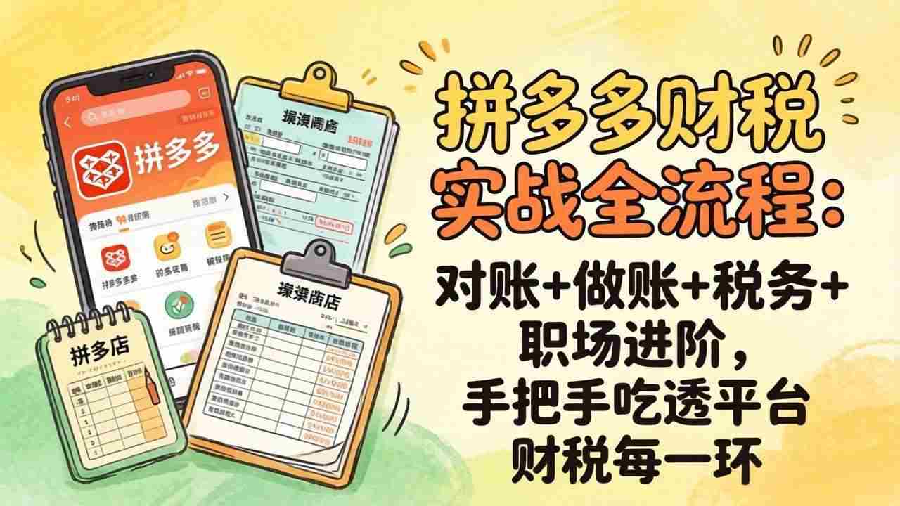 本课程是一套专为拼多多财税从业者打造的实战全流程体系,聚焦“对账+做账+税务+职场进阶”四大核心模块。课程从电商财务工作流程入手,系统讲解拼多多对账所需报表(订单、售后、账单、推广)及导出路径、订单报表字段解释,深度拆解订单时点利润计算、账单时点利润计算、发货时点对账实操(收入确认、回款退款匹配、成本费用统计)及快递运费核对。账务处理涵盖收入成本退款、推广费、往来款确认,以及促销/货损/换货等特殊场景账务、财务软件建账做账结账。税务模块详解电商一般及特殊税务处理(买赠、积分、优惠券等)、拼多多涉税信息报送查询与核对、小规模/一般纳税人申报实操。此外还包含店铺收入成本毛利分析、利润表解读、退货率计算、单品毛利表制作等进阶技能,帮助学员从0到1掌握拼多多财税全链路,实现职场能力跃迁。